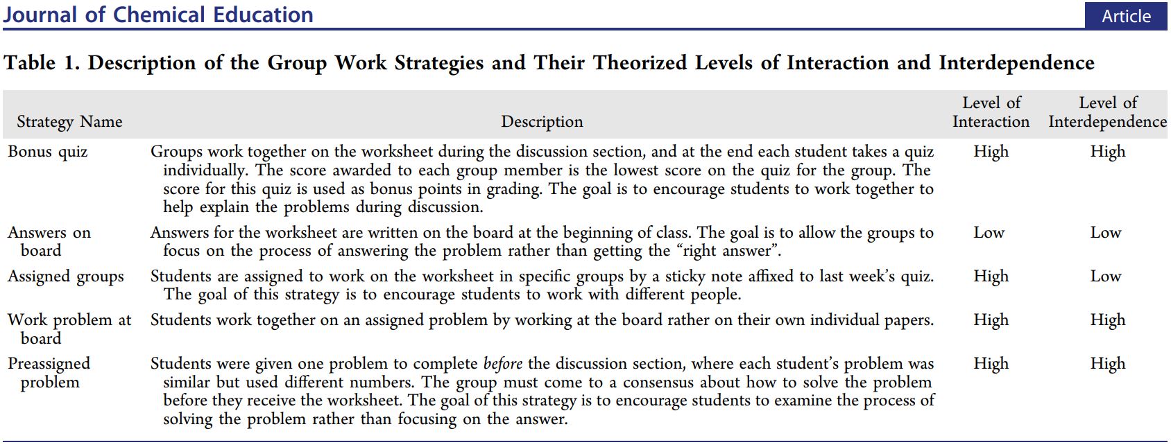 This 2019 article from by Thomson & Lamanna from the Journal of Chemical Education evaluates five different strategies used to “catalyze” group work.