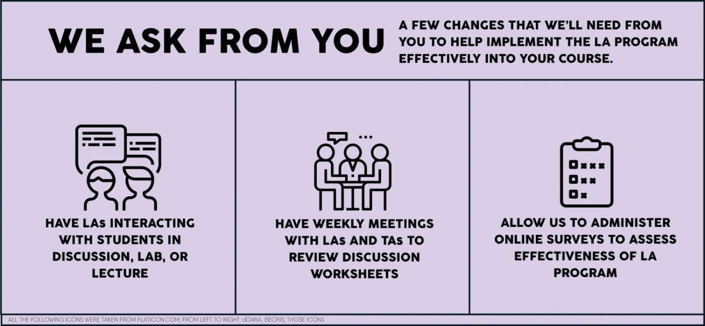 If you are interested in having Learning Assistants, contact Shanna Shaked by week 3 of the previous quarter or as soon as possible. This will help get all the details sorted out to recruit LAs for your course.